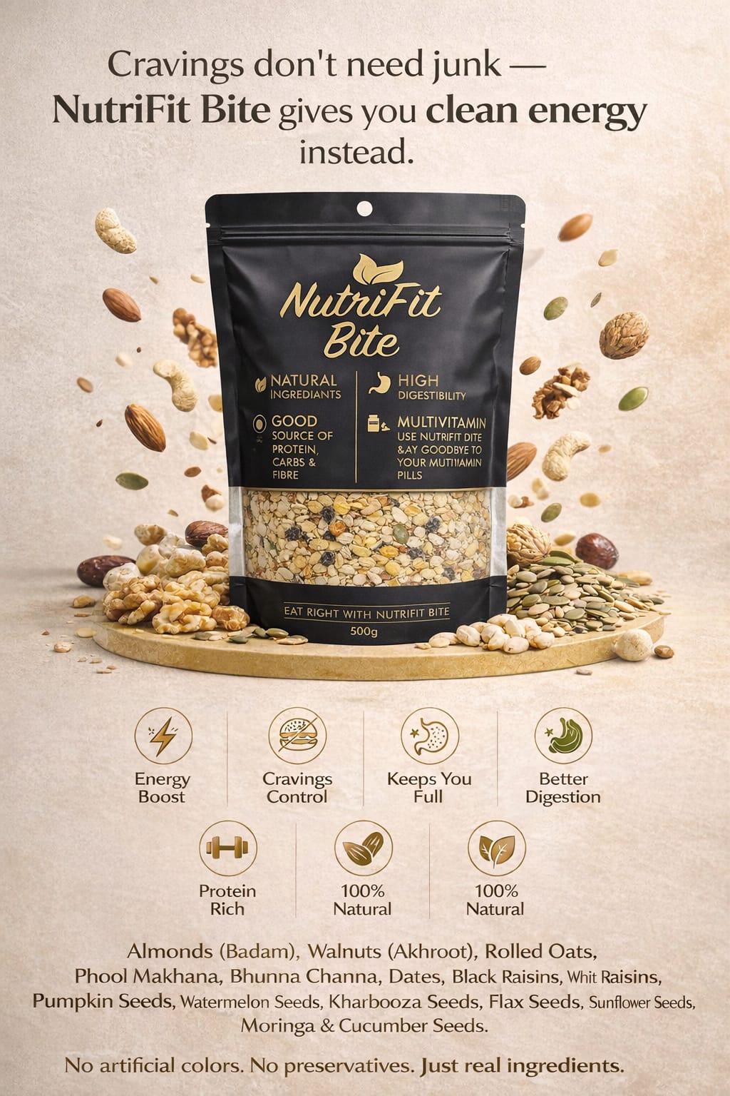 Every ingredient in NutriFit Bite is chosen for its nutritional value, not for trends or marketing claims. No artificial additives. No shortcuts.